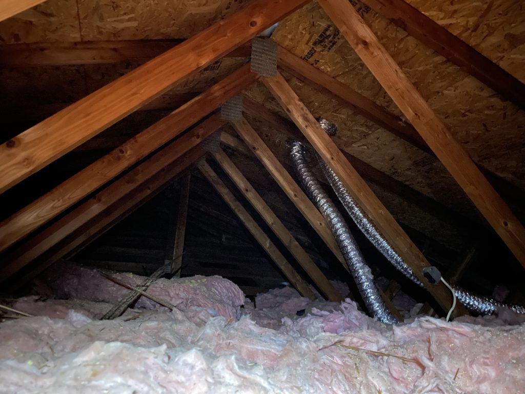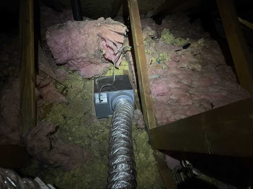 I complained about this when I originally discovered the bathroom fans exhausted into nowhere. Actually, I discovered one fan. The other fan I would later find to be buried completely under insulation. Both fans vented to the attic. Both lacked hoses. And one was covered. Not very effective.