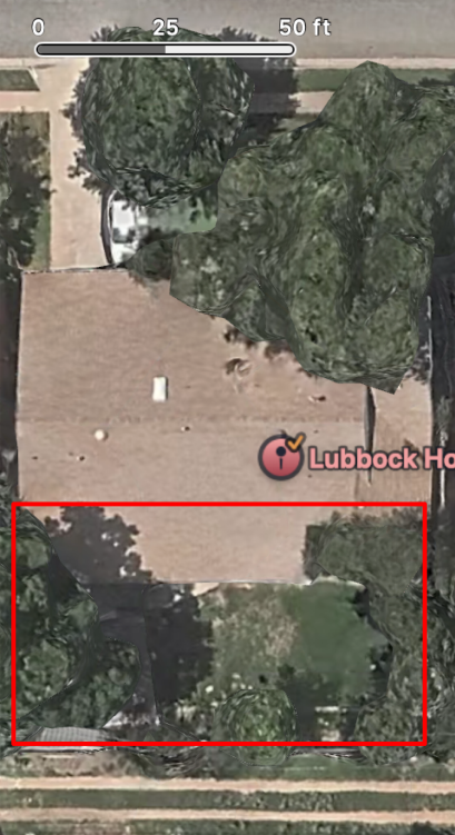 The red box roughly highlights the back yard section. And if the satellite distance reference is accurate, I calculate my pen to have been about 3000 sq ft. Or ~0.07 acres.