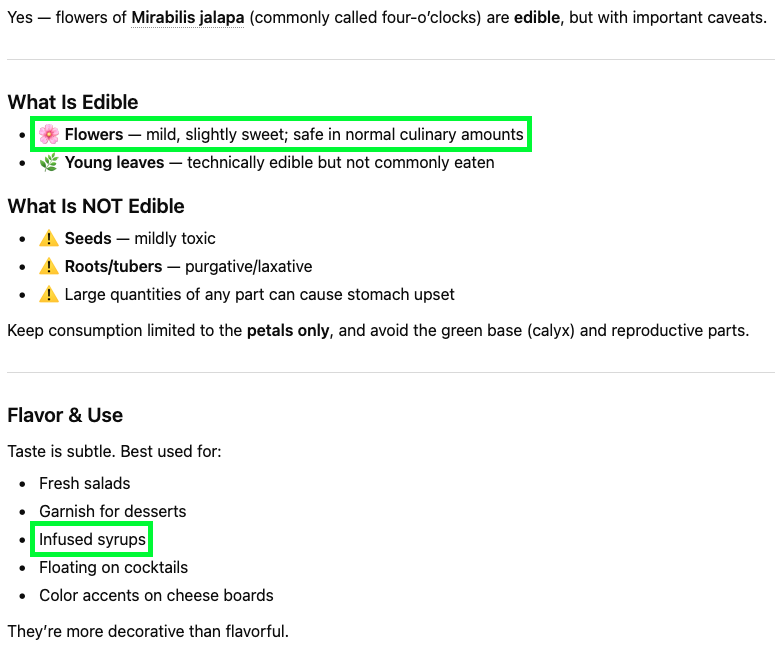 Fast forward to today and I was watching Netflix. And as with any Netflix show involving food, that Danish chef guy was there talking about his amazing restaurant and how he forages ingredients. But, for the first time, I noticed a certain flower being used as a garnish. Nasturtium flowers always show up, because they’re pretty and taste peppery. But this looked different. I swear it was a four o’ clock flower. This necessitated a quick internet search.