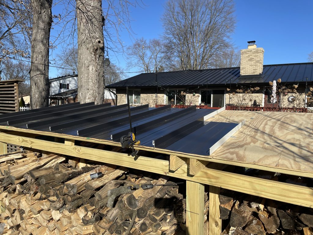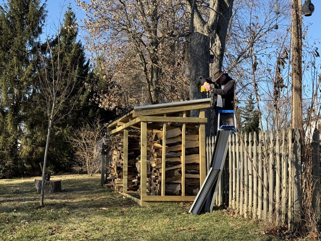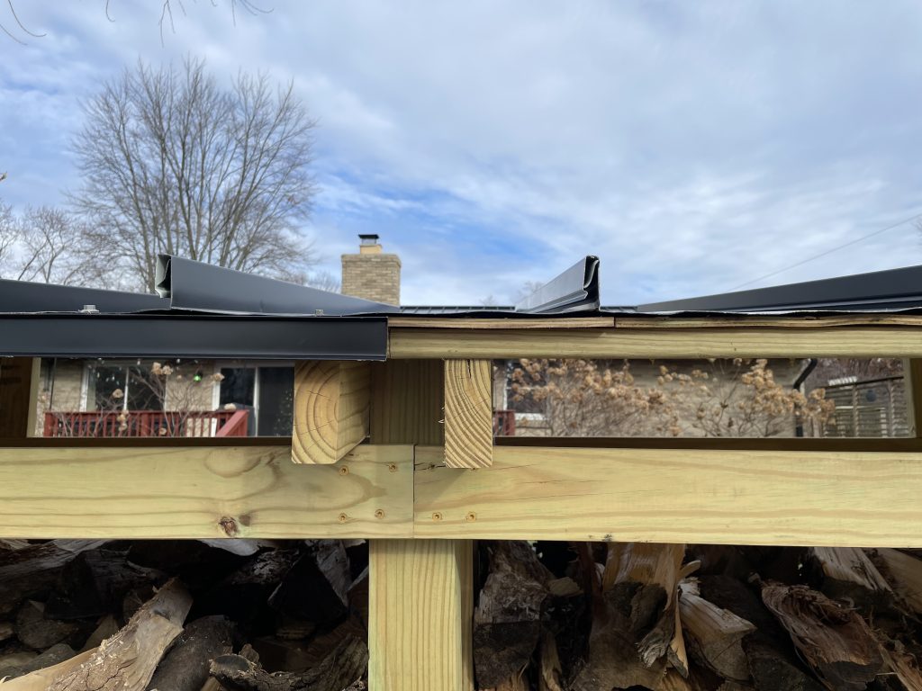 But as these were not full panels, they lacked the undercurve. They’re designed to hook under the eaves so no hardware is exposed skyward, but as I didn’t have 15 full panels to work with, that wasn’t an option and I had to screw them directly in. I wasn’t concerned. It is just a wood pile. Even if they leak over time, it’s a non-issue.