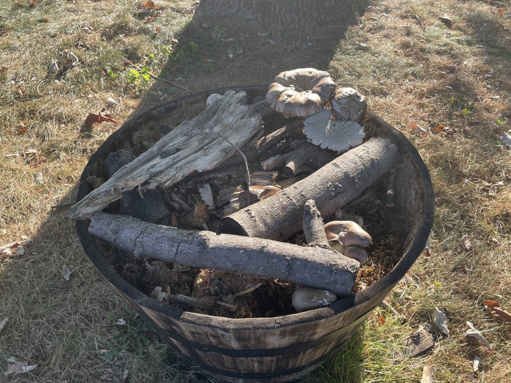 But the wine caps, for which I created a dedicated “garden” in a half bourbon barrel with straw, failed to fruit despite clear signs of ongoing inoculation. Finally, after nearly 6 months, they appeared.