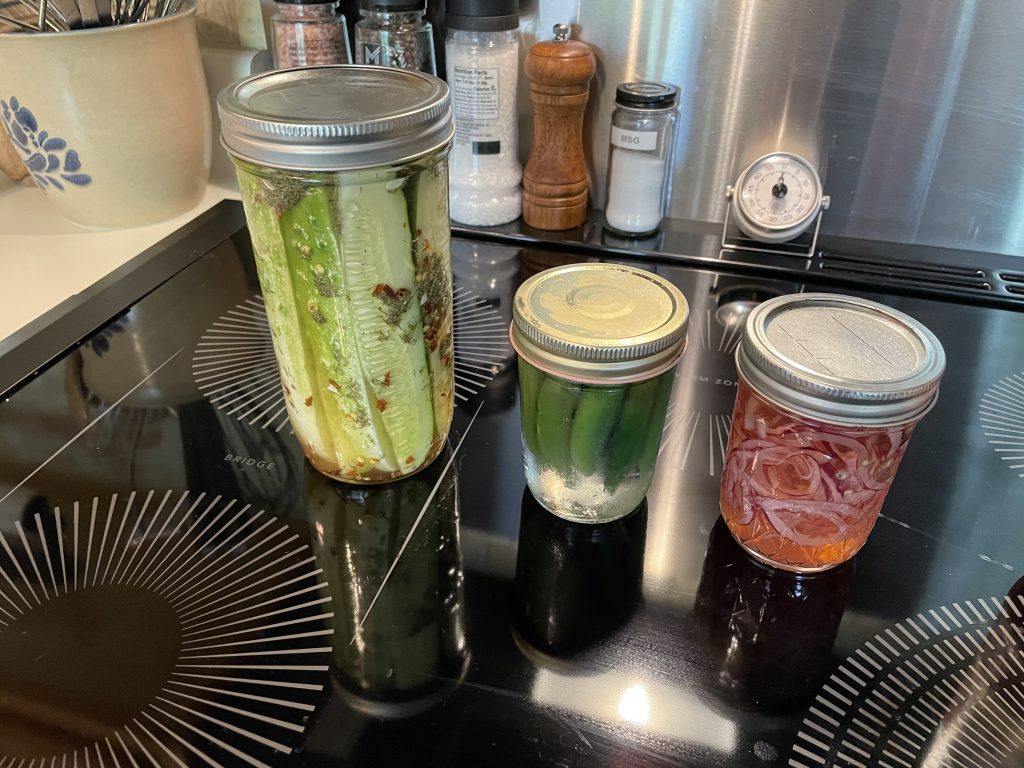 We have cucumbers (there’s an abundance from the garden right now and the kid wanted to make some after learning about it at summer camp), serrano peppers, and red onions. So far, the red onions are pretty good. One of the most ridiculously up-charged items to buy, by the way. More street tacos in the future!